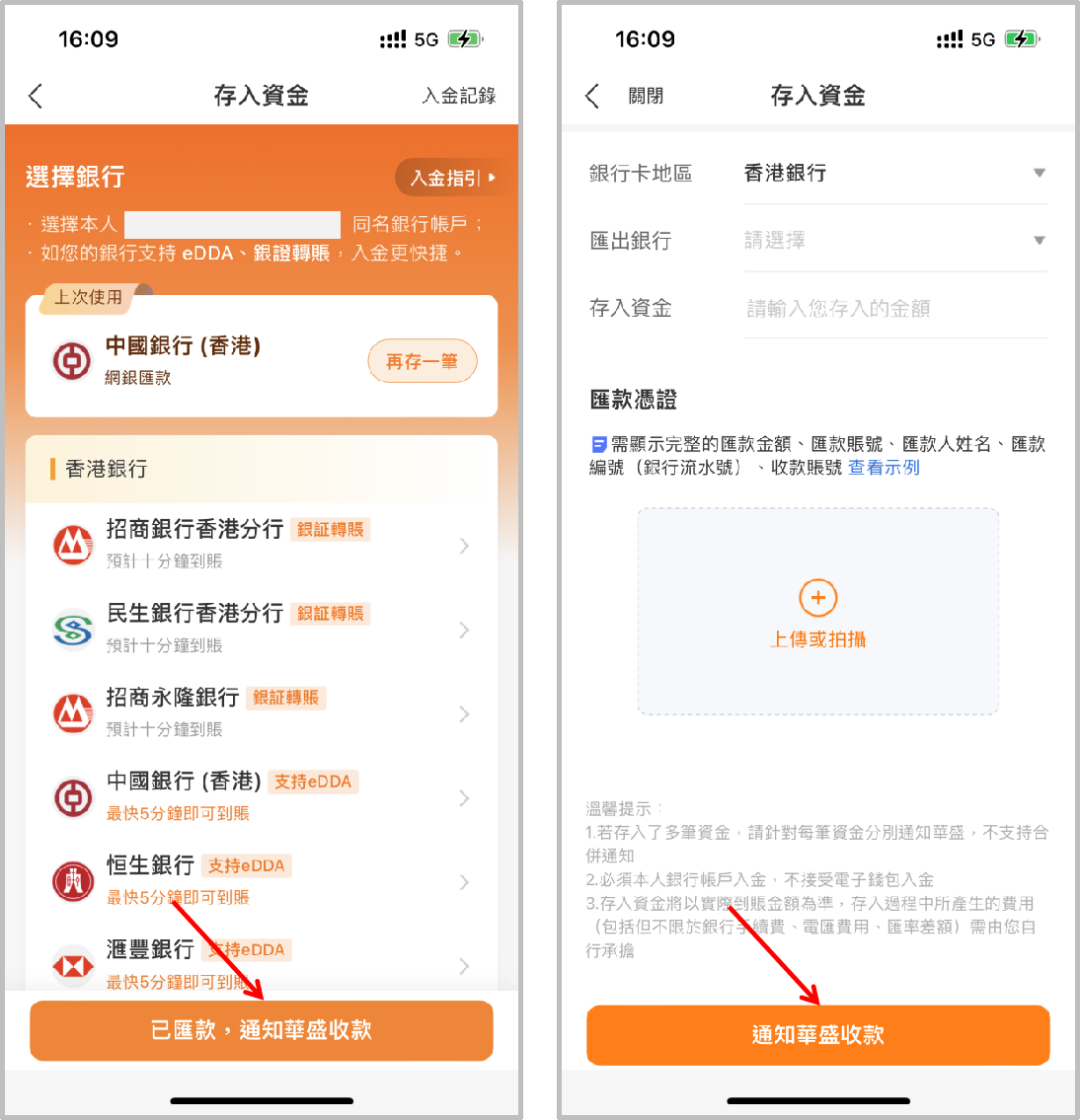 6.目前華盛不支持由香港銀行櫃檯、ATM等渠道直接存入現金的入金。